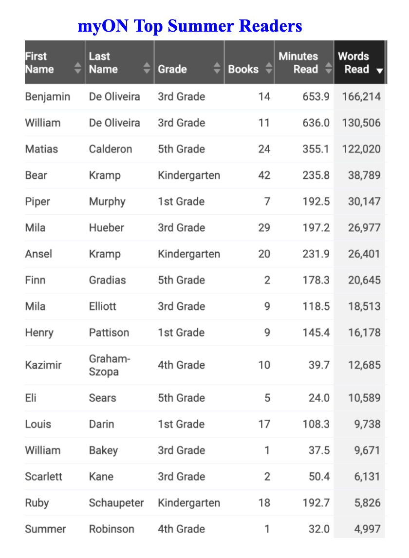 Check out our top summer myON Readers so far! Every Cold Spring student can access over 3,000 online books and news articles to read throughout the summer. The best part is that every book your child chooses from is set at his/her reading level. Research shows that in order for students to make growth in their reading they must be reading 20-30 minutes a day within their Zone of Proximal Development (ZPD). Every student has taken a reading assessment (STAR Reading) this month to ensure every book they are reading is within their ZPD.